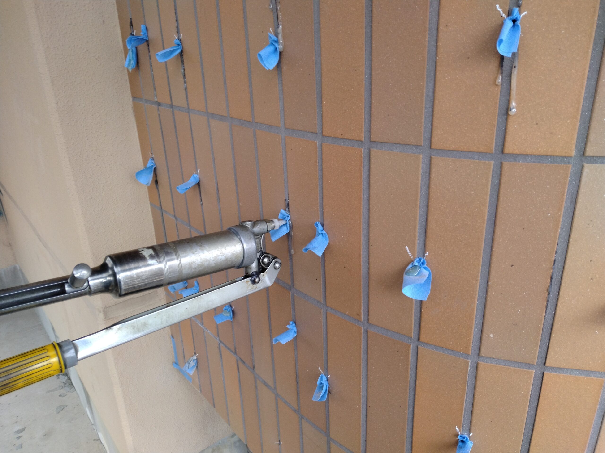この時、かなりの圧が穴の中にかかるため目地と先端のノズルの隙間から材料が漏れてうまく穴の中に入らない可能性があるため、