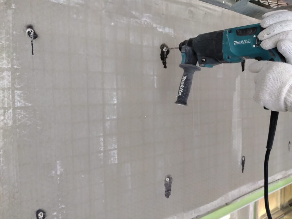 繊維ネット、ステンレスアンカーピンによる剥落防止工法は、外壁タイルやコンクリートの落下を防ぐため、繊維ネット、炭素繊維配合のポリマーセメントモルタルにて強固な剥落防止層を形成し、その層を注入口アンカーピンなどを使用し下地に固着させてタイルやモルタルの剥落を防止します。
